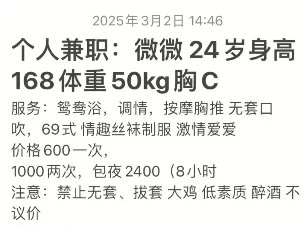 立即登录拿到联系方式,火速联系上小姐姐,通过她给的地址,顺利到达,见面第一眼,开启全身扫描验货,很年轻,符合我的预期,沟通完项目,闲聊了一会,她说她之前在江苏,现在和闺蜜一起在长沙了,问了她其他闺蜜的联系方式,都住在一栋楼里面,下次来也方便,服务就正常服务吧,课表上有的都会服务一遍,这个价格服务是一方面,重在别人确实年轻,下面粉嫩紧实,没几下我就泄力了,萝卜青菜各有所爱,喜欢皮肤白嫩年轻的可以尝试,喜欢少妇熟妇的狼友不建议。